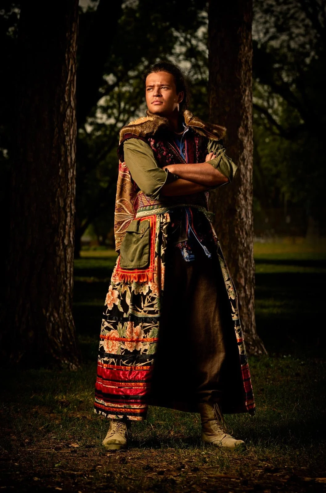 Description: This photograph depicts a Shakespearean actor, dressed in a patterned tunic, standing with their arms crossed within a clearing of trees. Their head is turned over their right shoulder facing the artificial light source. I created this portrait as part of a Baroque-ish series to document actors in a post-colonial/post-apocalyptic version of Othello using my Sony a7R IV camera with 70-200mm f2.8 lens and the Godox AD1200 pro and AD600 pro lights.