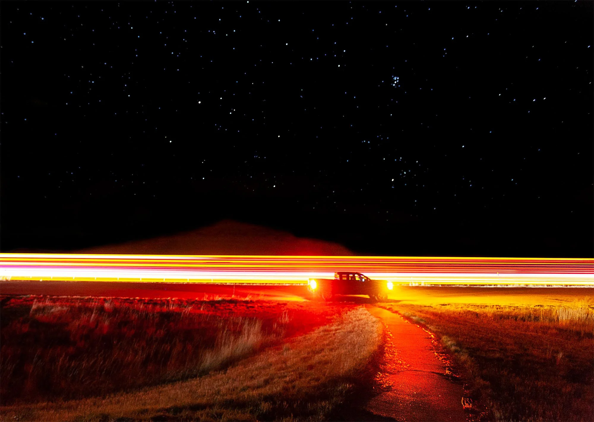 Description: This horizontal photo shows a truck crossing a rural path under the night sky. Traffic zips by in the background, noted by the bands of warm light created when the student dragged their shutter. This exercise allowed the student to explore motion with the use of slow shutter speeds and practice using tripods.
